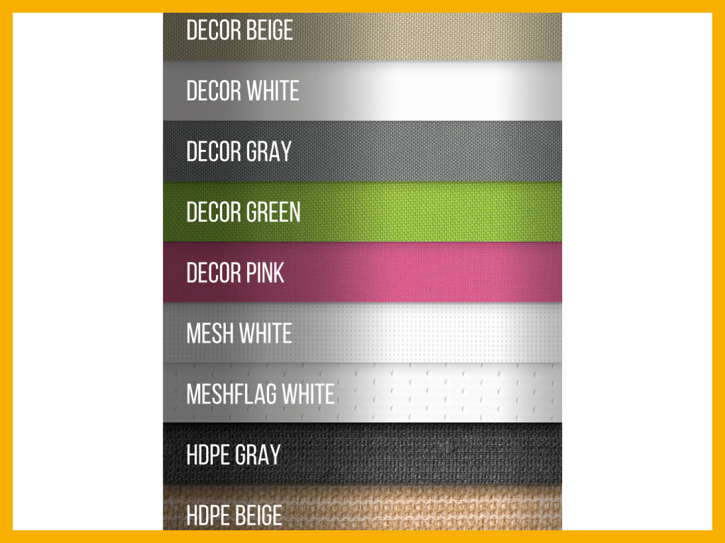 - tkaninę decor 200 g/m² kolory biały, beżowy, popielaty i zielony do produkcji: żagli wodoszczelnych premium, rolet rzymskich, żagli rozsuwanych, zasłon oraz osłon balkonowych,