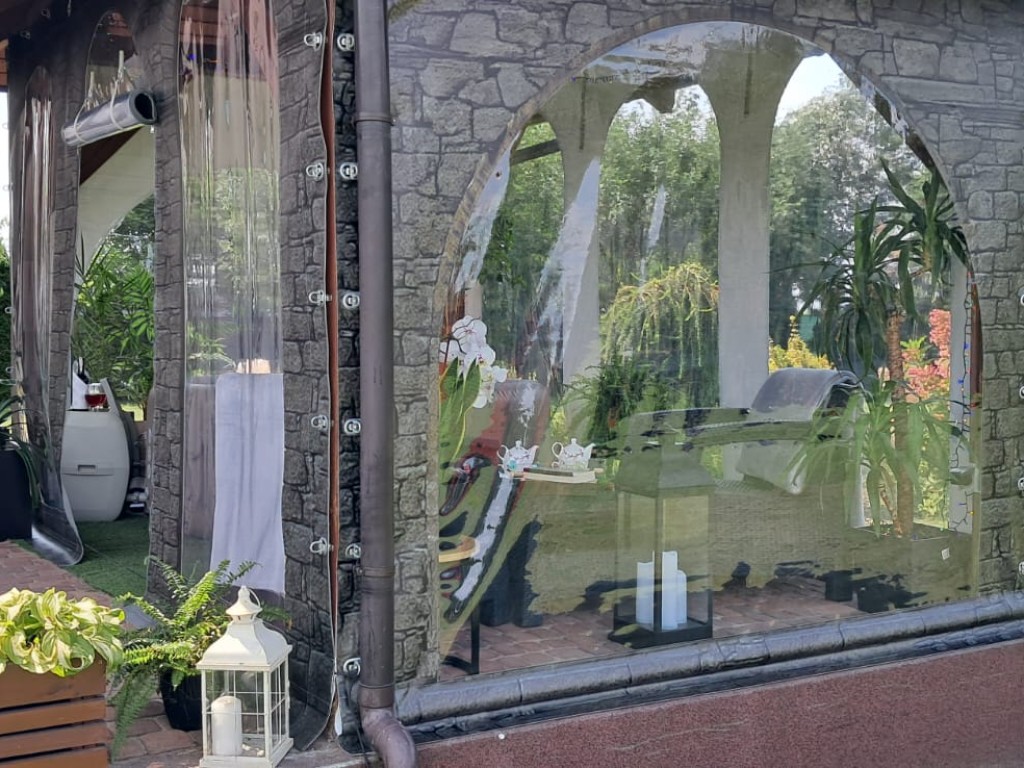 Przezroczysta osłona tarasowa stworzona jest po to, aby skutecznie zabezpieczyć przestrzeń przed deszczem, wiatrem i chłodem. Dzięki niej możesz korzystać z tarasu lub altany również poza sezonem letnim. To świetne rozwiązanie zarówno do prywatnych ogrodów, jak i dla branży gastronomicznej – restauracji, kawiarni czy barów. Każda osłona na taras na wymiar powstaje z wytrzymałego materiału plandekowego o gramaturze 650 g/m² oraz wyposażona jest w przeźroczyste okna o grubości 0,7 mm. Standardowe wykończenie obejmuje oczka w górnej i bocznych krawędziach oraz tunel dolny o szerokości 10 cm. Konstrukcja jest solidna, a przy tym bardzo łatwa do utrzymania w czystości.