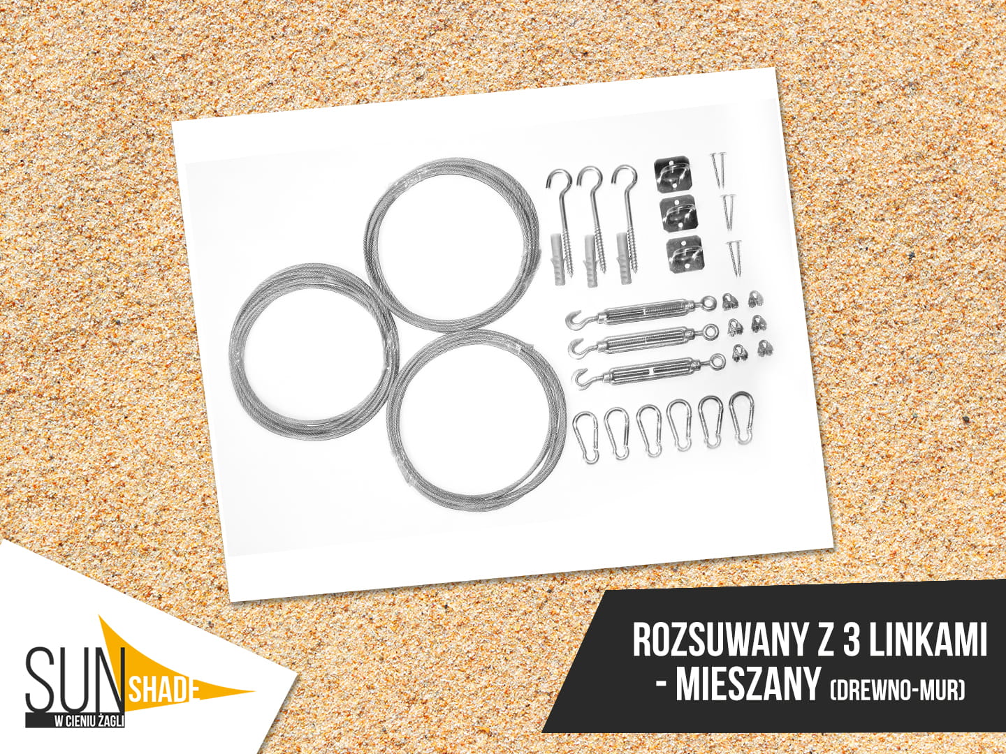 Przez oczka montażowe nabite na krawędziach żagla, przeciągnięta jest linka stalowa, która pozwala na rozsuwanie lub zsuwanie żagla w zależności od aktualnej potrzeby. Akcesoria do montażu znajdziecie Państwo na innych naszych aukcjach.